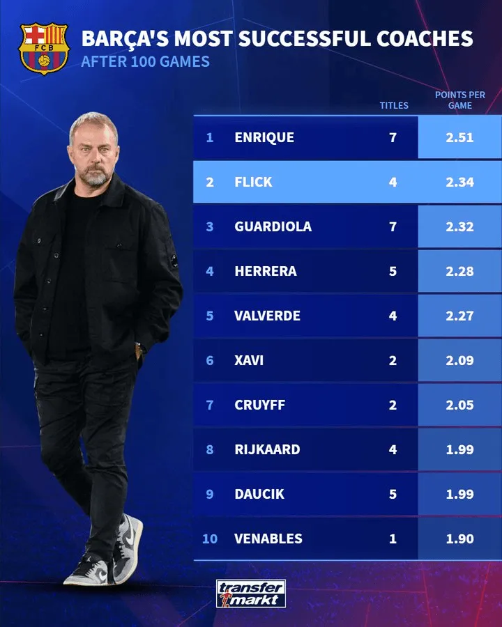 虎扑03月03日讯 德国转会市场盘点了执教巴塞罗那的主教练在满100场时的场均积分,详情如下: